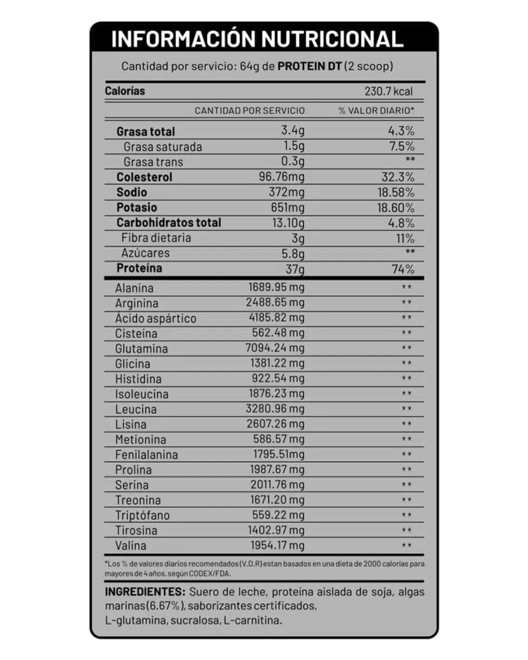 Es la proteína completa y de alta calidad, elaborado a base de SUERO DE LECHE, AISLADO DE SOJA Y ALGAS MARINAS, importante por su aporte de fibra, además contiene L-GLUTAMINA y L-CARNITINA.